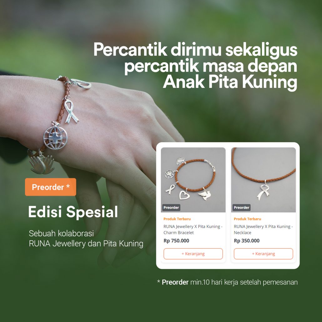 Bersama RUNA Jewellery, kamu bisa mempercantik tampilan kamu sekaligus mempercantik masa depan 40 Anak Pita Kuning (APK). Terdapat beberapa jewellery cantik yang bisa level-up outfit kamu. Setiap 50% hasil penjualan, akan didonasikan ke Pita Kuning. Produk RUNA Jewellery X Pita Kuning tersedia di e-commerce Tokopedia dan Shopee.